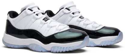The instantly recognizable patent leather rand found on the 11 gets updated for this 'Emerald' colorway with a shiny iridescent finish. The 11 Retro Low ‘Emerald swaps out the ballistic mesh traditionally found on its high-top counterpart for a premium all-leather build. Featuring a white upper with a matching lace loops . an icy rubber outsole completes the look.