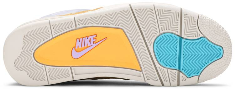 Releasing as part of the renowned retailer’s 30th anniversary festivities . the Union LA x 4 Retro ‘Desert Moss brings back the creative partners modified AJ4 from 2020. This p is taken from a capsule dubbed ‘Tent and Trail . featuring colors and materials inspired by outdoor gear . The mid-top carries an upper built with a blend of bright purple mesh and mustard yellow suede. Vibrant pops of turquoise land on the lower molded eyelets and heel tab . marked with branding in a lavender hue. A stitched fold-down tongue . yellow ‘UN/LA tag and translucent TPU wings are carried over from the 2020 release. The sneaker is mounted on an off-white polyurethane midsole with an aqua-tinged -sole unit under the heel.