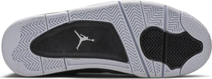 The 4 Retro 'Fear' features a black . Pure Platinum . and Cool Grey upper with white accents. The design also includes a black speckled midsole . red unit . and a white outsole. Released in August 2013 . the sneaker dropped alongside 3 and 5 'Fear' colorways.