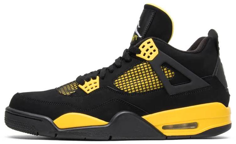 The 2012 edition of the 4 Retro ‘Thunder brings back one-half of the coveted ‘Thunder and Lighting pack from 2006. Smooth black nubuck is utilized on the upper . with contrasting yellow accents on the eyelets . quarter panel and interior tongue. The latter features a woven Jumpman-branded tag on the exterior side . complementing a second Jumpman logo on the molded heel panel. Lightweight cushioning arrives via a yellow polyurethane midsole with a visible sole unit nestled in the heel.