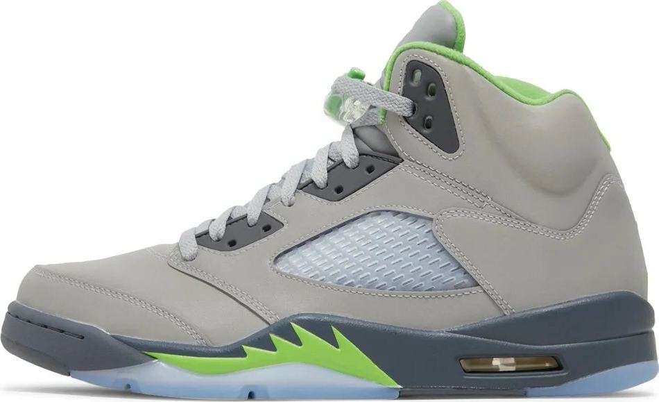 The 2022 edition of the 5 Retro ‘Green Bean brings back a distinctive two-tone colorway initially released in 2006. Like the original, the mid-top carries a light grey nubuck upper entirely coated in a reflective finish. Bright green accents make their way to the interior lining and the embroidered Jumpman logo that decorate the heel and tongue. The vivid hue is repeated on the shark-tooth detailing that enlivens the dark grey polyurethane midsole. Underfoot, a translucent herringbone-tread rubber outsole provides grippy traction. The 5 'Green Bean' 2022 will release on May 28, 2022.