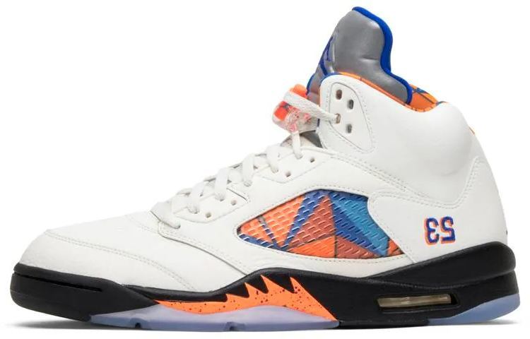 The 5 Retro “Orange Peel . aka ‘The International Flight .it is a tribute to Michael ’s impact on the popularity of basketball around the world. The colorway was specifically inspired by the blue and orange uniforms that wore for an exhibition game in Barcelona in August 1990 for a Europe promotional tour. The design features a Sail tumbled leather upper accented by a blue and orange pattern based on Barcelona’s iconic street art . visible on the lining and through the quarter panel mesh. The shoe also includes the 5’s signature 3M reflective tongue . a black midsole with orange shark-tooth detailing and a translucent outsole underfoot.
