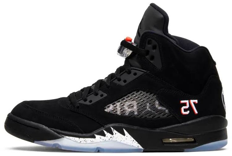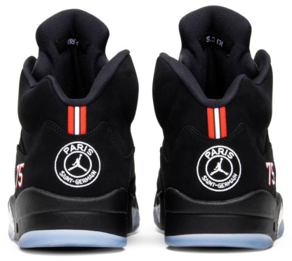 Brand debuted the 5 Paris edition as part of their new partnership with the Paris Saint-Germain Football Club. The shoe features black nubuck uppers with the team’s crest embroidered on the heel with a Jumpman at the center. Other signature details include “Paris text on the midfoot net . Paris zip code in place of stitched on the lateral heel . and team slogan “ICI C’EST PARIS . which translates to “Here is Paris . on the insole.