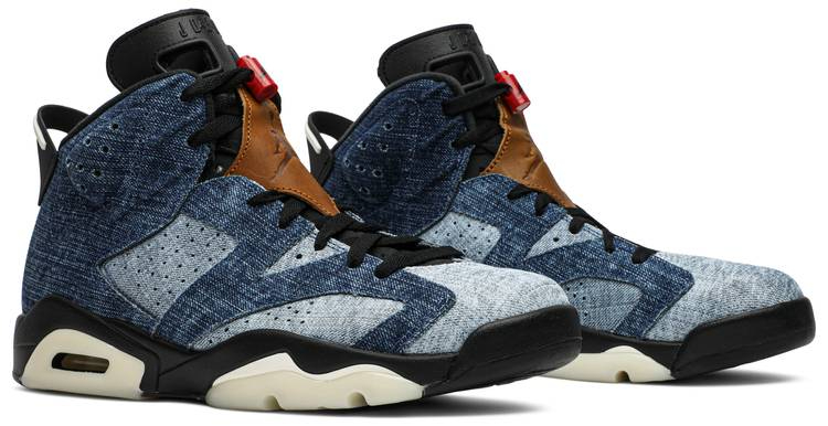 Famously inspired by Michael 's German sports car . the 6 Retro conveys speed and class. This version��unveiled in December 2019��transforms the icon from court performer to street ready through a 'Washed Denim' upper with the signature synthetic tongue. Touches of Varsity Red are placed on the rear spoiler and Jumpman branding on the neoprene sleeve. Its -Sole is set atop a translucent rubber tread pattern.