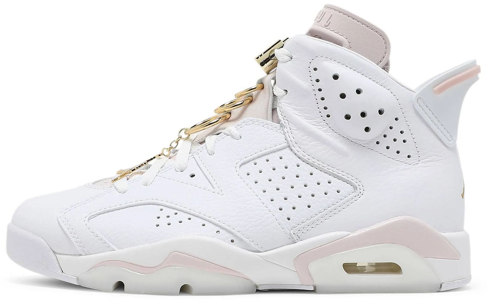 The women’s 6 Retro ‘Gold Hoops adds gilded accents to the shoe that Michael wore when he clinched his first ever NBA championship. The vintage mid-top carries a white tumbled leather upper with Barely Rose hits on the tongue . heel tab and midsole . fitted with a visible -sole unit in the heel. Metallic gold lace locks are matched by a trio of earring-inspired gold hoops . with a Jumpman charm attached to the lowest ring via a short gold chain. Underfoot . milky translucent rubber is utilized on the outsole.