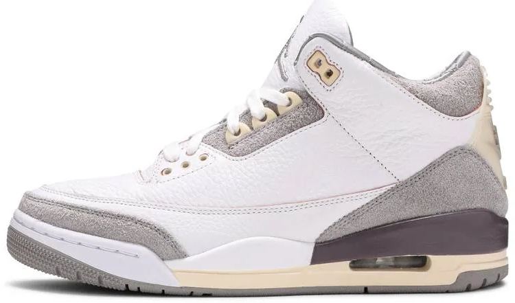 The A Ma Maniére x 3 Retro SP ‘Raised By Men treats the iconic silhouette to a premium makeover. The Atlanta-based retailer dresses the mid-top in tumbled white leather . overlaid with soft grey suede at the collar . eyestay . heel and toe. Mismatched Jumpman and A Ma Maniére branding is embroidered on each tongue . featuring a quilted lining that’s repeated on the interior collar. A subtle cream hue is applied to the molded heel panel . decorated with an embossed logo . and polyurethane midsole. Violet-colored detailing wraps around the heel . providing a contrasting pop of color.
