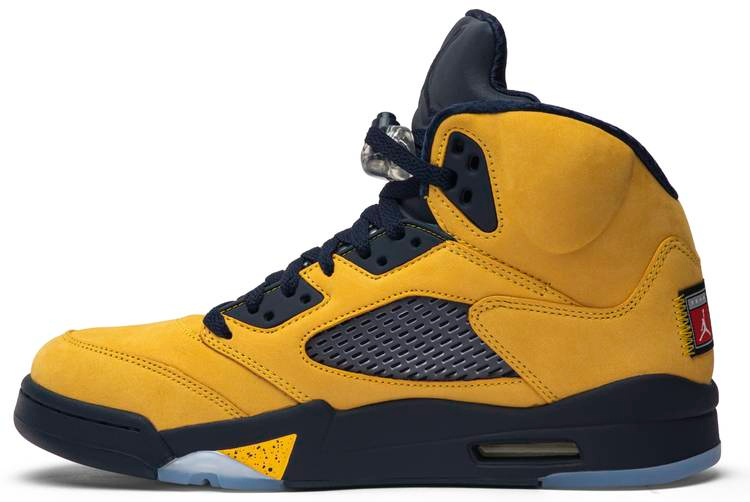 Released in August 2019 . the 5 Retro 'Michigan' sneaker pays homage to the legendary Michigan Wolverines through official team colors. Its Amarillo nubuck upper is tooled with TPU mesh midfoot inserts . toggled lacing and a forward-facing . embroidered Jumpman. The style's mor is worn on the reflective tongue . with a retro tag stitched to the heel. A speckled shark tooth graphic is placed on the sidewall . finished off with a Navy midsole that showcases the visible unit and an icy translucent outsole.