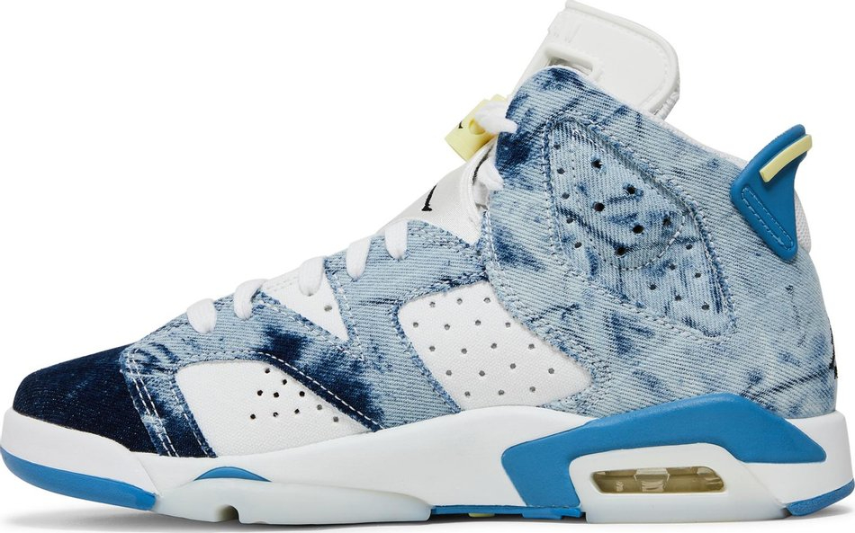The 6 GS “Washed Denim is kid’s-exclusive colorway of Michael ’s sixth signature shoe with a trippy, acid wash denim on its design. The “Washed Denim 6 GS features a white leather base with colorful contrasting washed denim overlay panels. A black Jumpman logo is embroidered on the heel above classic “Air branding. An additional black embroidered Jumpman is found on the white neoprene lace overlay. Lime Green accents the rear heel spoiler. The visible unit in the heel is bordered by light blue paneling, which completes the look. Release date: May 15, 2022