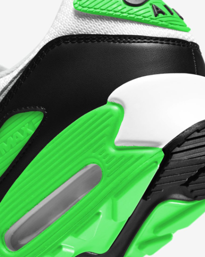 The 90 ‘Lime’ celebrates the 30th anniversary of the retro runner with traditional color blocking, executed on a recrafted build that’s faithful to Tinker Hatfield’s original 1990 design. A breathable white mesh upper is overlaid with grey synthetic suede paneling and a black leather mudguard. The sneaker’s TPU accents, along with the ‘cassette’ frame wedged into the midsole, deliver contrasting pops of lime green.